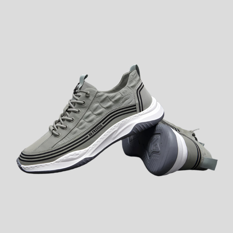 Command understated style and everyday performance with the UrbanCroc Drift by Celonox. These sleek sneakers feature a sophisticated grey leather-effect upper embossed with a subtle croc pattern, accented by tonal stitching and contrasting black stripe details. The sculpted white EVA midsole and grippy black outsole cushion each step, while the lace-up silhouette and padded collar ensure a secure, comfortable fit.
