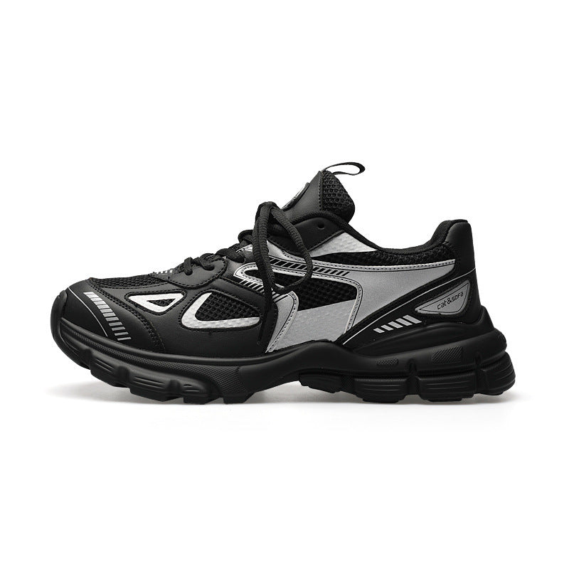 Dominate your workout and the streets in the NightRift Tech by Celonox—where sleek aesthetics meet rugged functionality. These dynamic sneakers feature a breathable black mesh base overlaid with durable synthetic leather panels in matte black and reflective silver for enhanced visibility. Precision-engineered cutouts provide targeted airflow, while the sculpted black EVA midsole and grooved rubber outsole deliver responsive cushioning and multidirectional traction. Finished with tonal pull tabs and contrast stitching, the NightRift Tech blends technical performance with modern style.