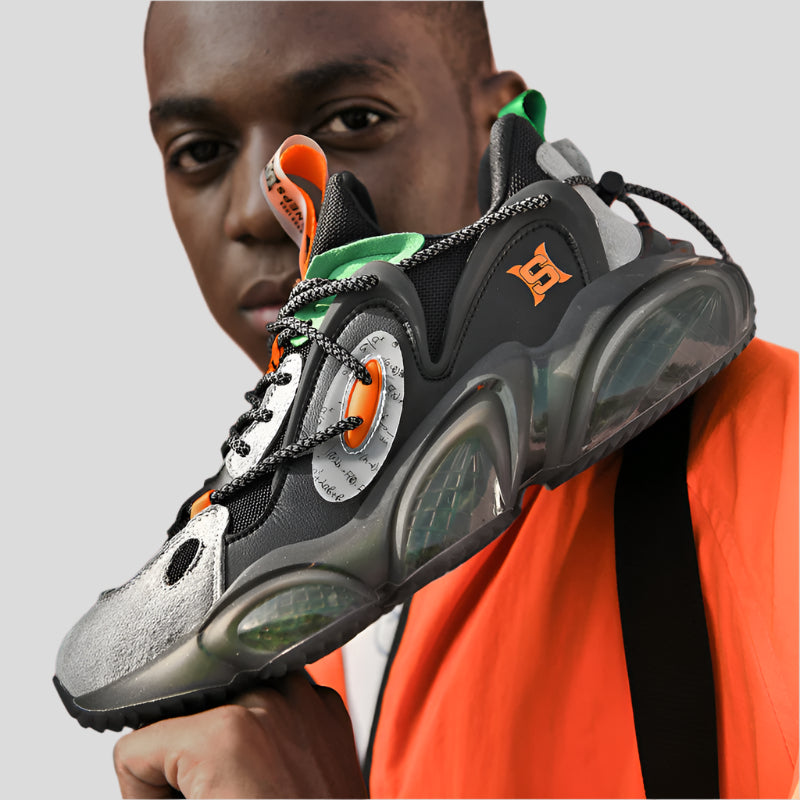 Discover a new era of avant-garde footwear with the PulseOrb Neo by Celonox. These boundary-pushing sneakers pair a rugged black mesh and leather base with grey suede overlays and neon orange and green accents for a high-contrast, futuristic look. The signature sculpted “bubble-pod” midsole houses translucent cushioning pods for next-level shock absorption and energy return, while the grippy rubber outsole keeps you grounded on any surface.