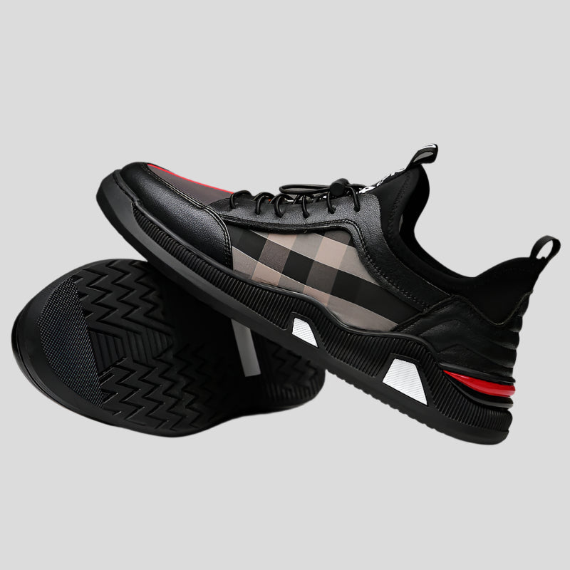 Make a statement in the GridGuard Noir by Celonox—where luxury plaid meets minimalist performance. These sleek sneakers feature a smooth black synthetic-leather upper with semi-transparent side panels showcasing a muted beige-and-charcoal plaid grid. A stretchy neoprene collar and quick-adjust toggle laces ensure a snug, sock-like fit, while contrasting red accents and tonal pull tabs add refined flair. Underfoot, the sculpted black EVA midsole and rubber outsole deliver lightweight cushioning and confident grip on city streets or indoor settings.